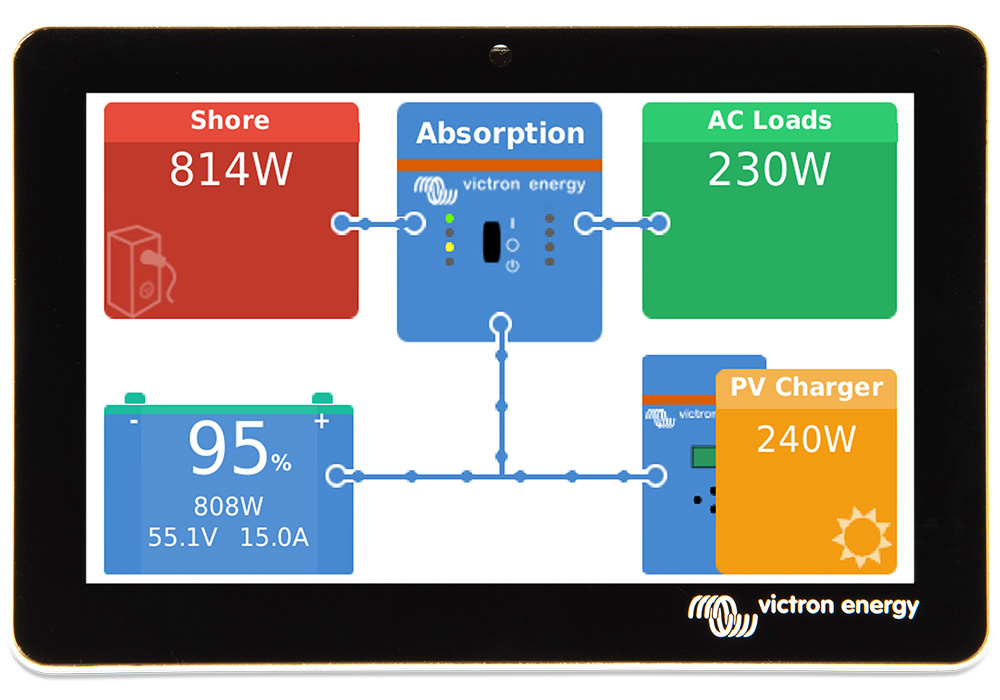 The GX Touch 50 is the display monitor for the Cerbo GX. The 5" touch screen display gives an instant overview of your system and allows you to adjust settings in the blink of an eye.